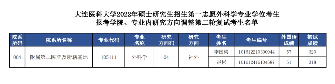 现对啪啪啦 2022年硕士研究生招生第一志愿外科学专业学位考生报考学院、专业内研究方向调整第二轮复试考生名单进行公示,请各位考生详细核对本人信息,如有疑问请与啪啪啦 招生办公室联系。