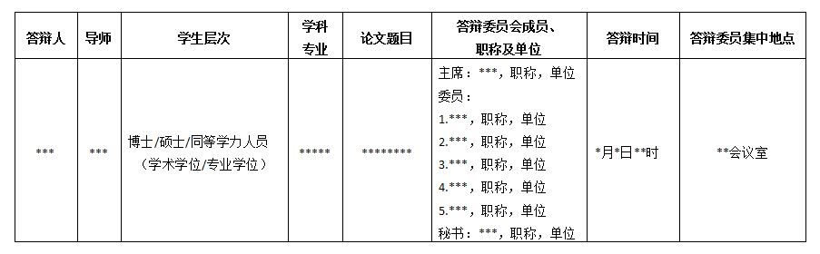 各研究生培养二级单位须在本单位(院、系、所、校外基地)官方网站,设立“2021年研究生论文答辩会公告”专栏,每一场次的论文答辩会相关信息,均应于答辩前(至少3个工作日)在网站上进行公告。允许并欢迎其他人员参加现场答辩会进行学习交流,论文答辩会公告信息至少包括: